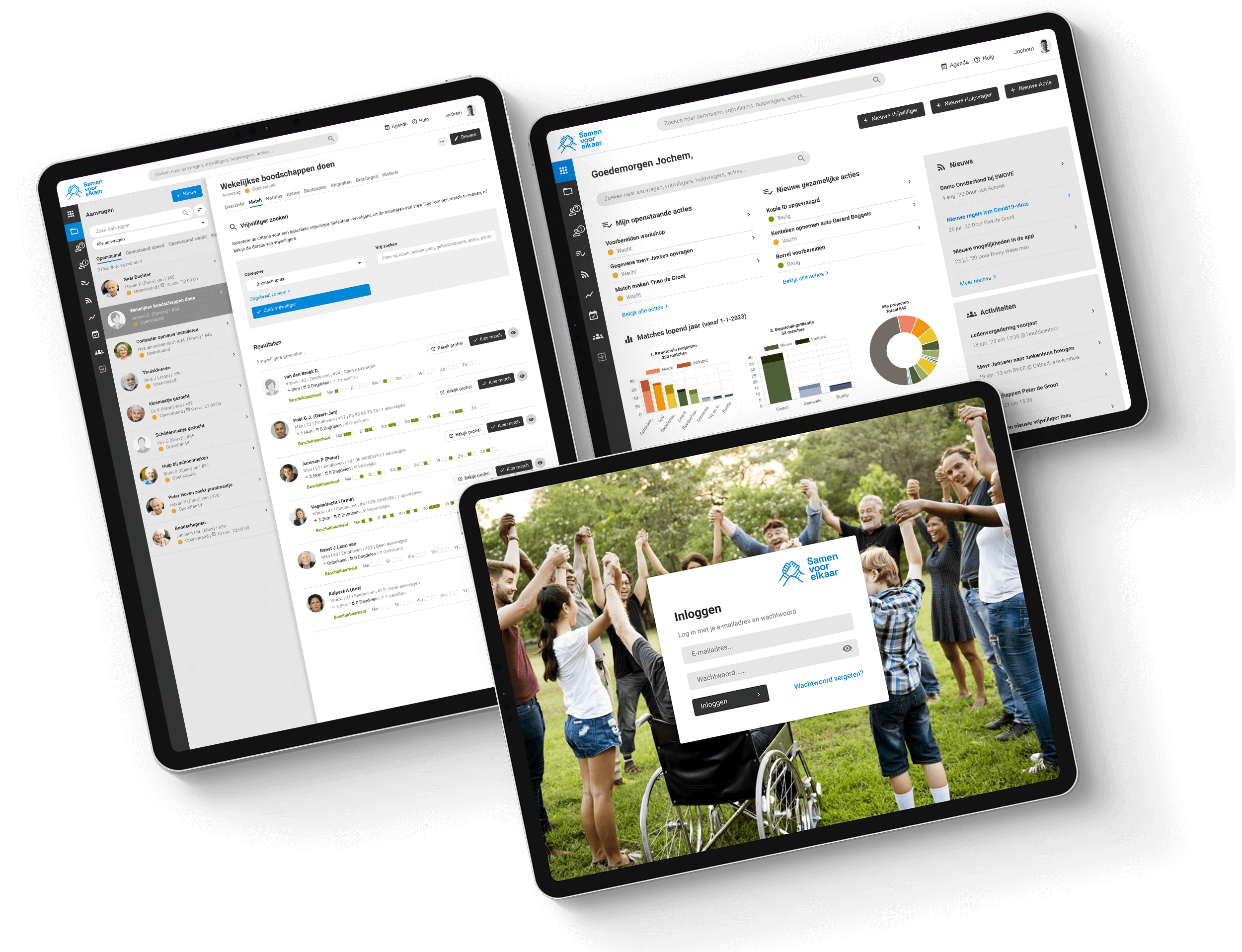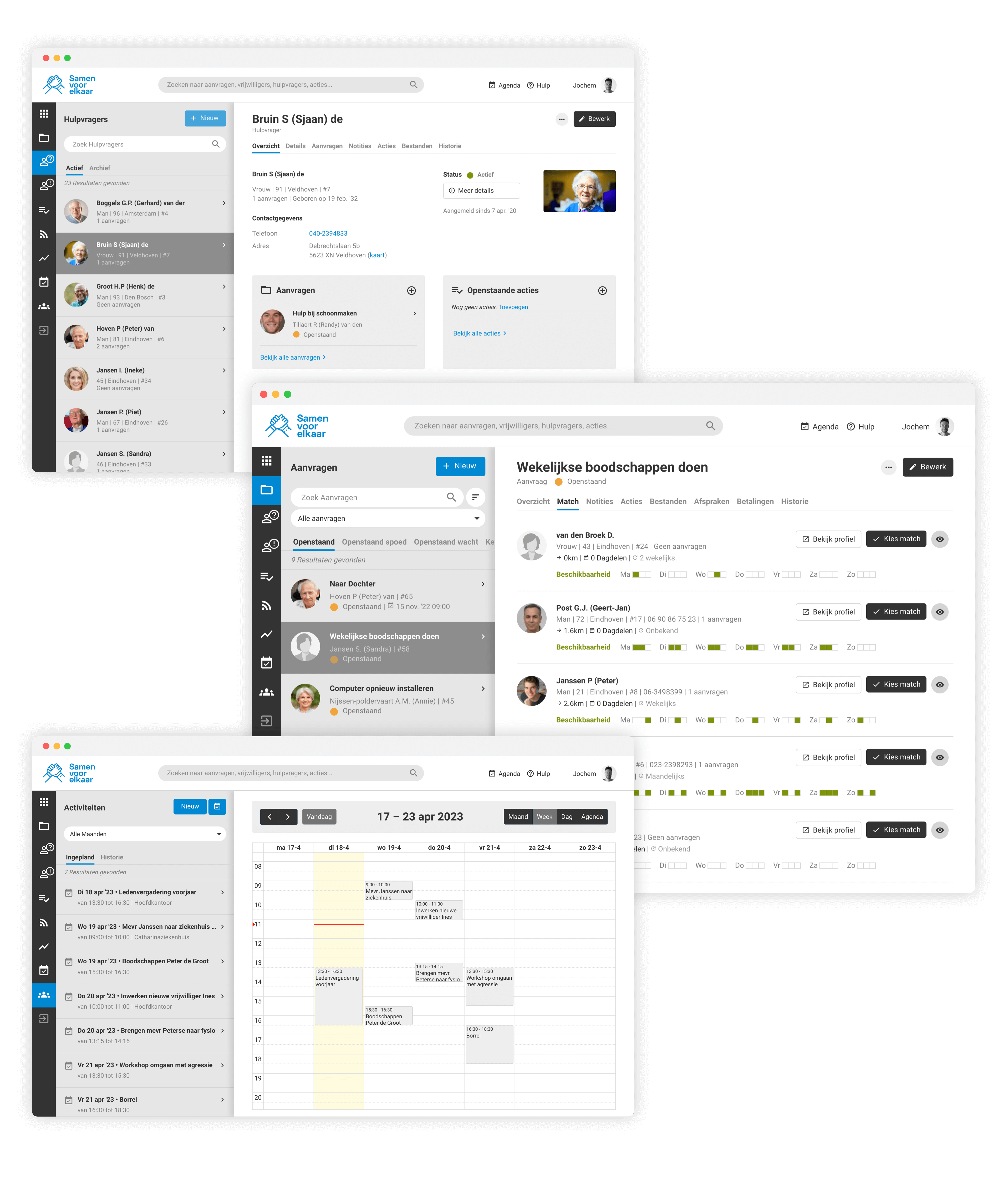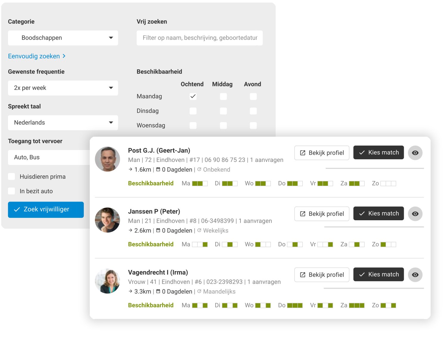 OnsBestand brengt alle informatie van vrijwilligers, hulpvragers en hulpvragen samen op 1 centrale online plek. Vraag en aanbod van hulpvragers en vrijwilligers kunnen gematcht worden op basis van beschikbaarheid, expertise en fysieke afstand. Het vinden van een geschikte beschikbare vrijwilliger is zo gepiept.